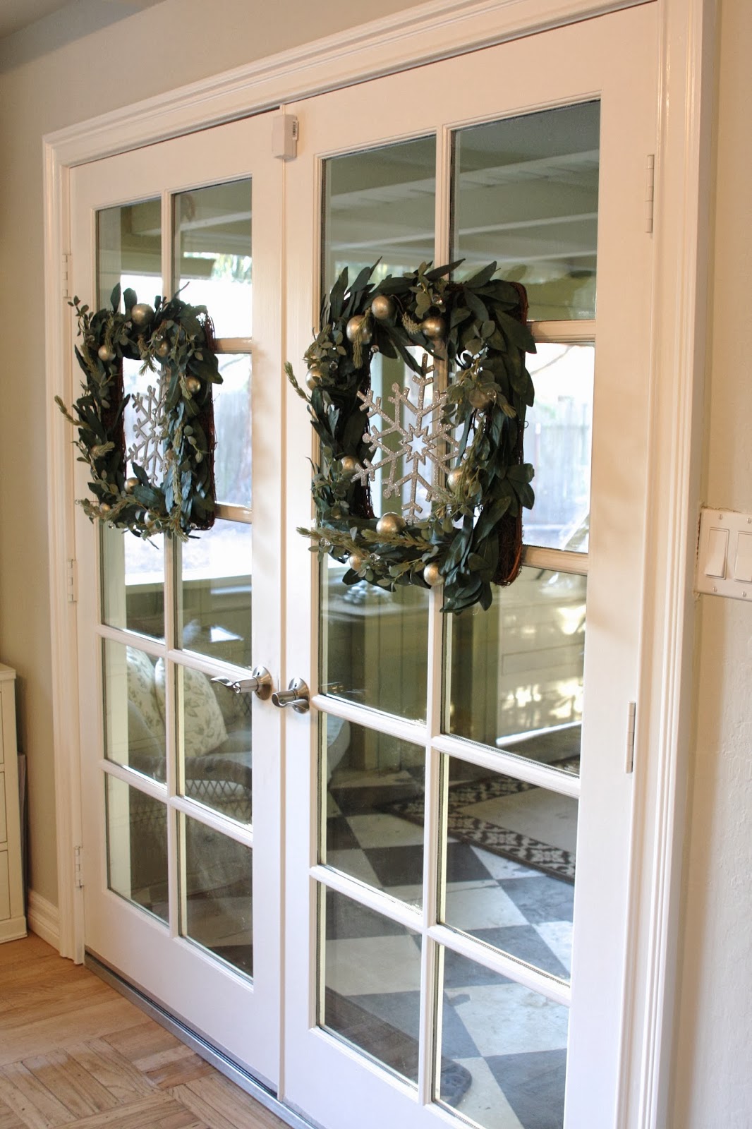 I've had these wreaths for years and used to hang them on the front double doors in Arkansas. This year, they are hanging inside and I added sparkly snowflakes in the middle...